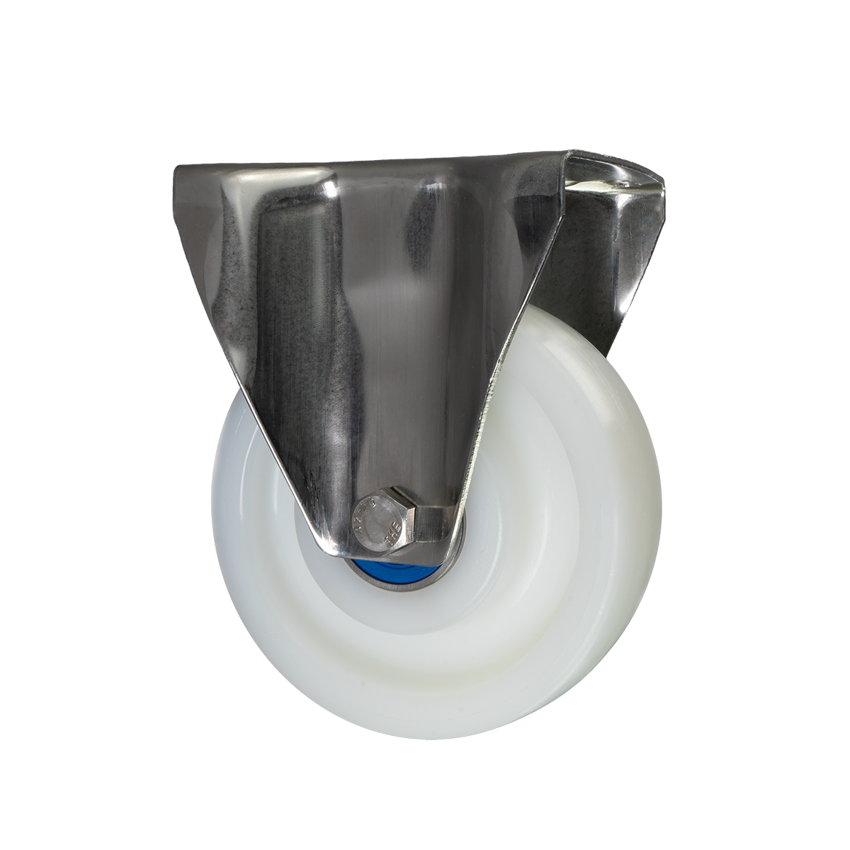Edelstahl-Transport-Starrrolle aus Edelstahl (gepresst), Plattenbeschlag, Rad aus Vollpolyamid (PA6), Präzisionskugellager aus Edelstahl, Rad-Ø 150mm, 700KG