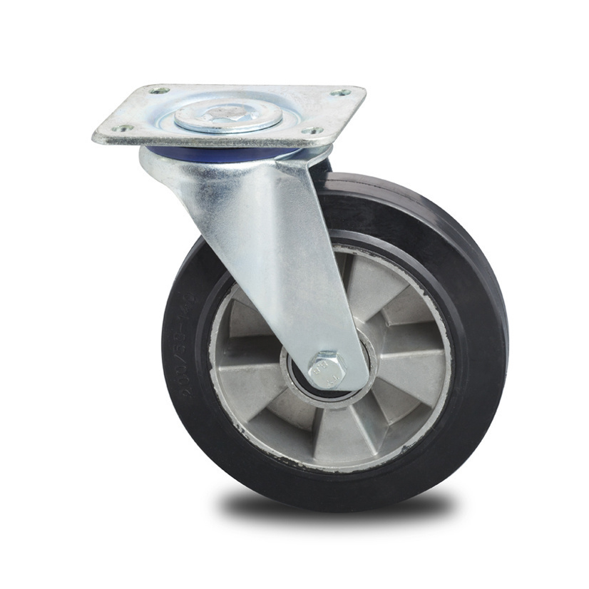 Industrielle Lenkrolle Ø160mm mit elastischem Gummireifen und verstärkter Gabel aus Stahlblech. Präzisionskugellager, Plattenmontage, 300kg Tragkraft.