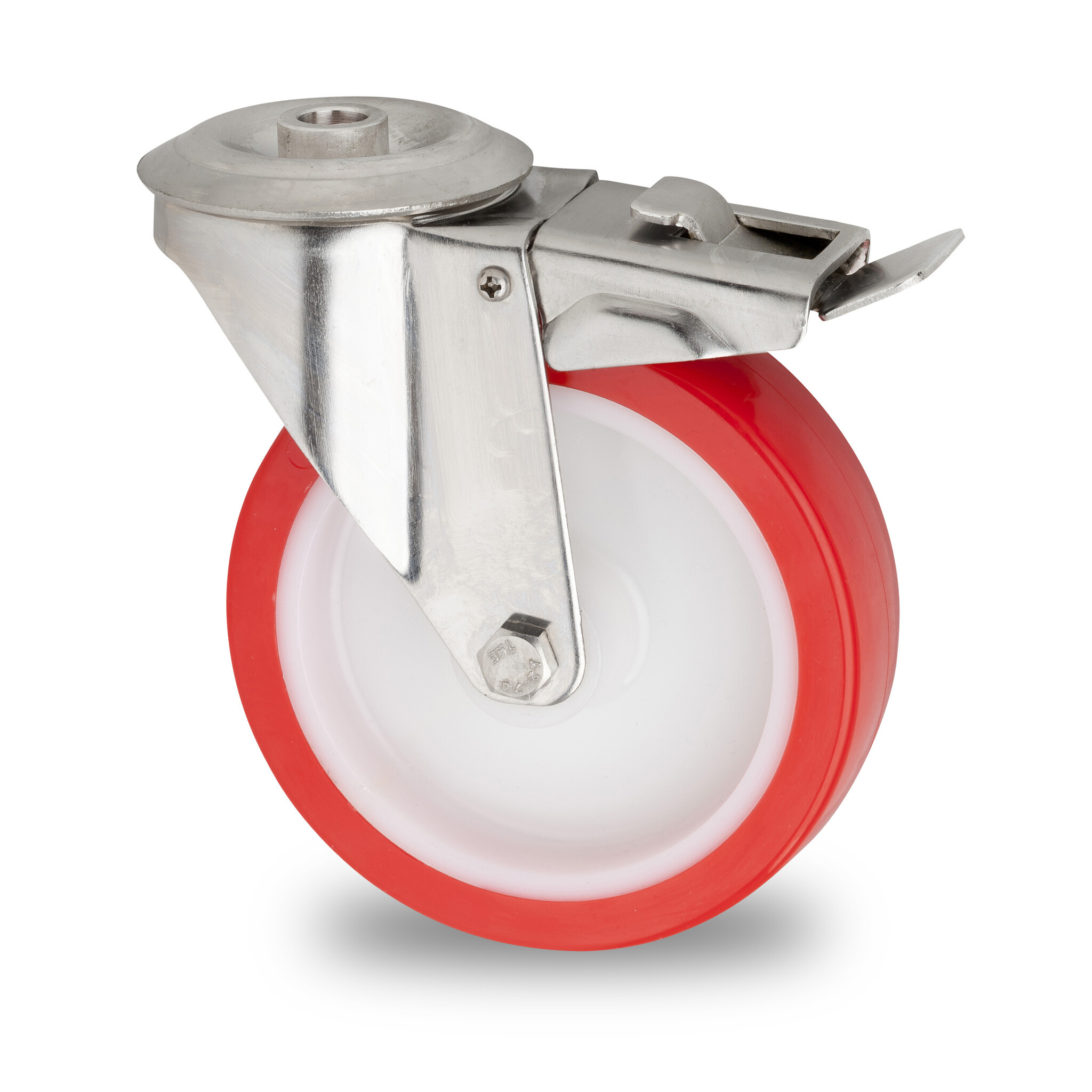 Edelstahl-Transport-Lenkrolle mit Bremse aus Edelstahl (gepresst), Bolzenlochbefestigung, lackiertes Polyurethan, Edelstahl-Rollenlager, Rad-Ø 80mm, 140KG