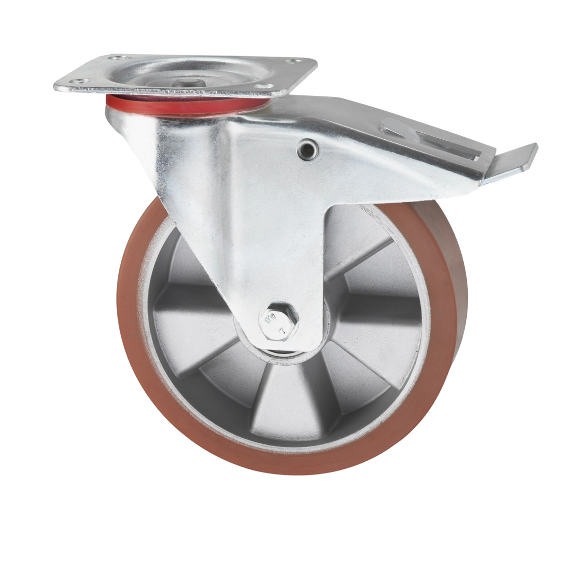 Transportgeräte Lenkrolle mit Feststeller aus Stahlblech, Plattenbefestigung, Vulkanisierte gegossenem Polyurethane Lauffläche, Präzisionskugellager, Rad-Ø 200mm, 400KG
