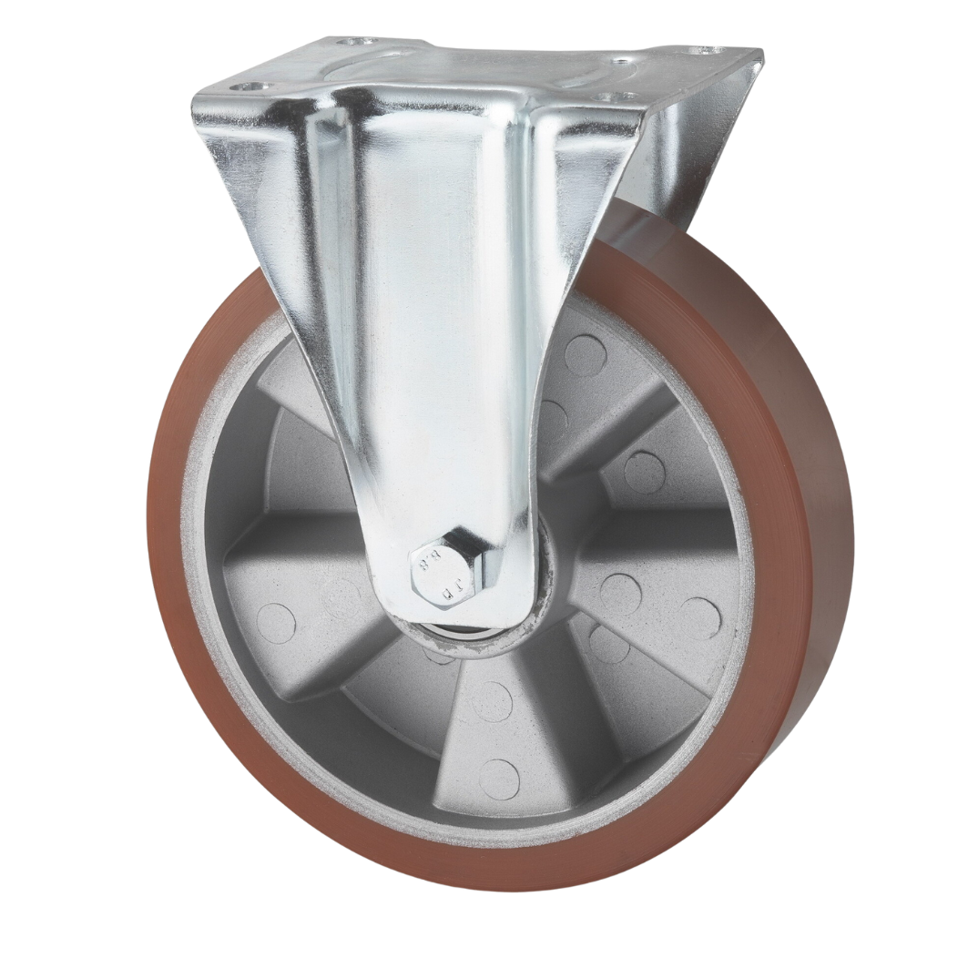 Industrial Fixed caster from pressed steel, plate fitting, Vulcanized Polyurethane tread, precision ball bearing, Wheel-Ø 160mm, 300KG