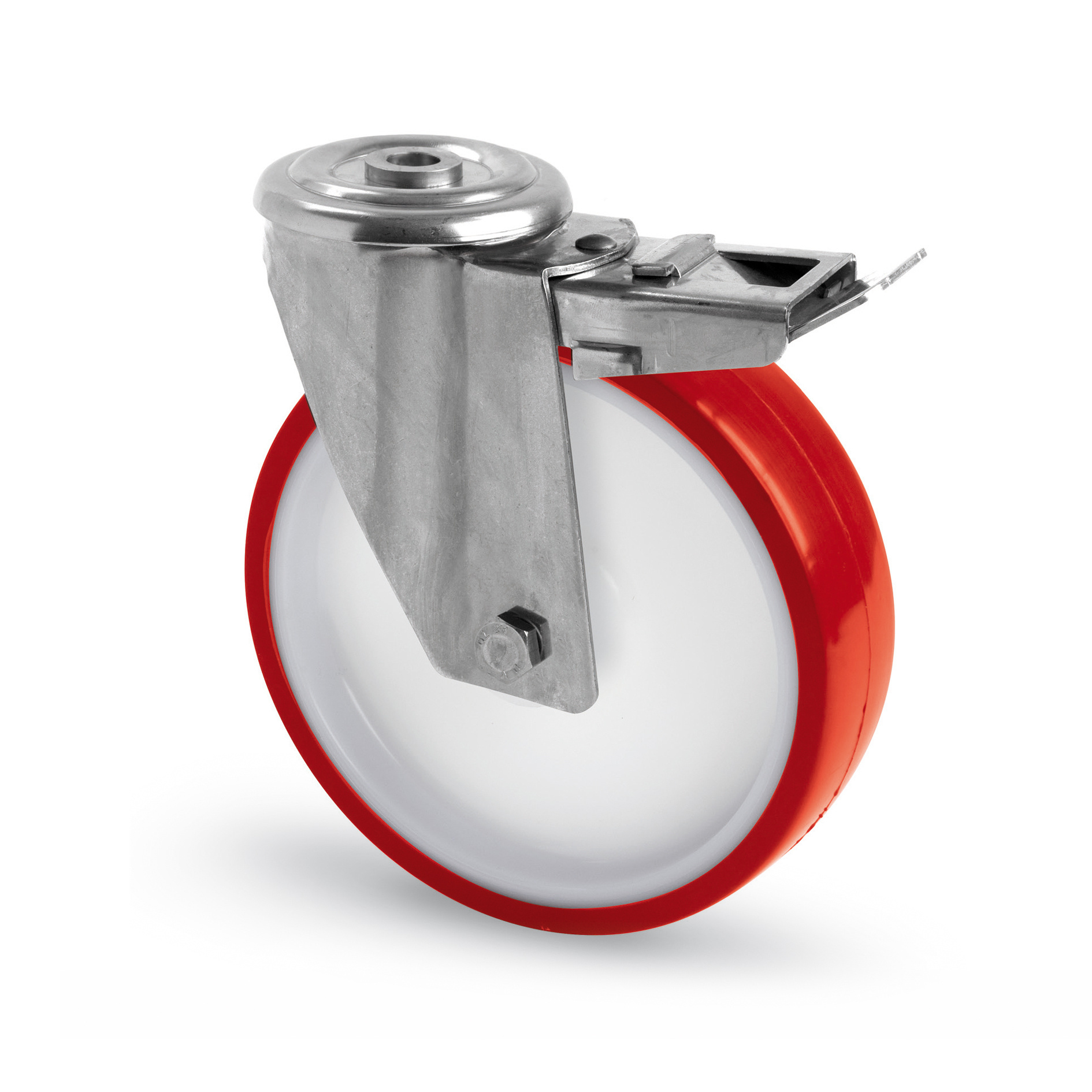 Stainless steel transport swivel castor with brake made of stainless steel (pressed), bolt hole mounting, sprayed polyurethane, sliding bearing, Wheel Ø 80mm, 120KG