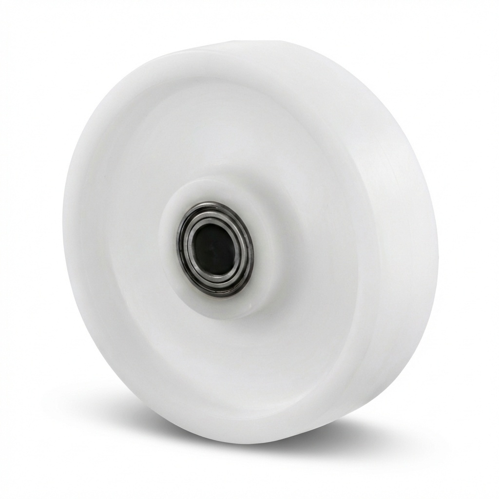 Industrial wheel Ø125x50mm, fully nylon (PA6) polyamide with precision ball bearing. Axle hole Ø20mm, hub length 60mm, 700kg load capacity. Durable and strong.