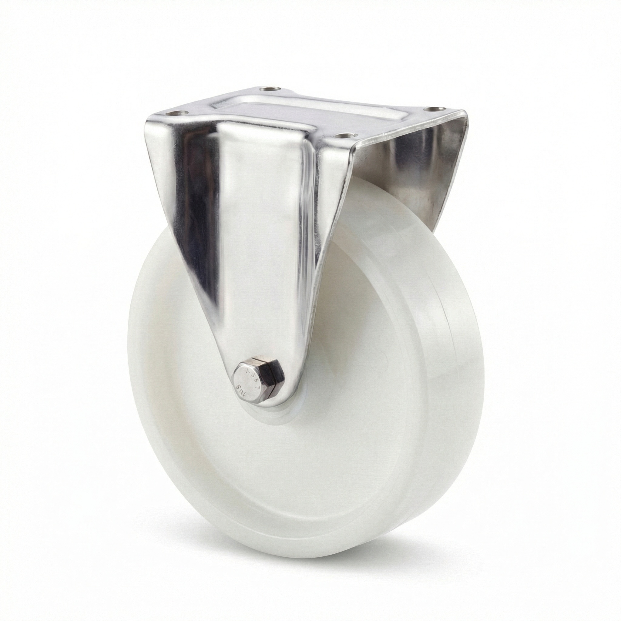 inox et anti-corrosion Roulette fixe de acier inoxydable embouti, Fixation à platine, Roue Polyamide, moyeu lisse, Roue-Ø 200mm, 500KG