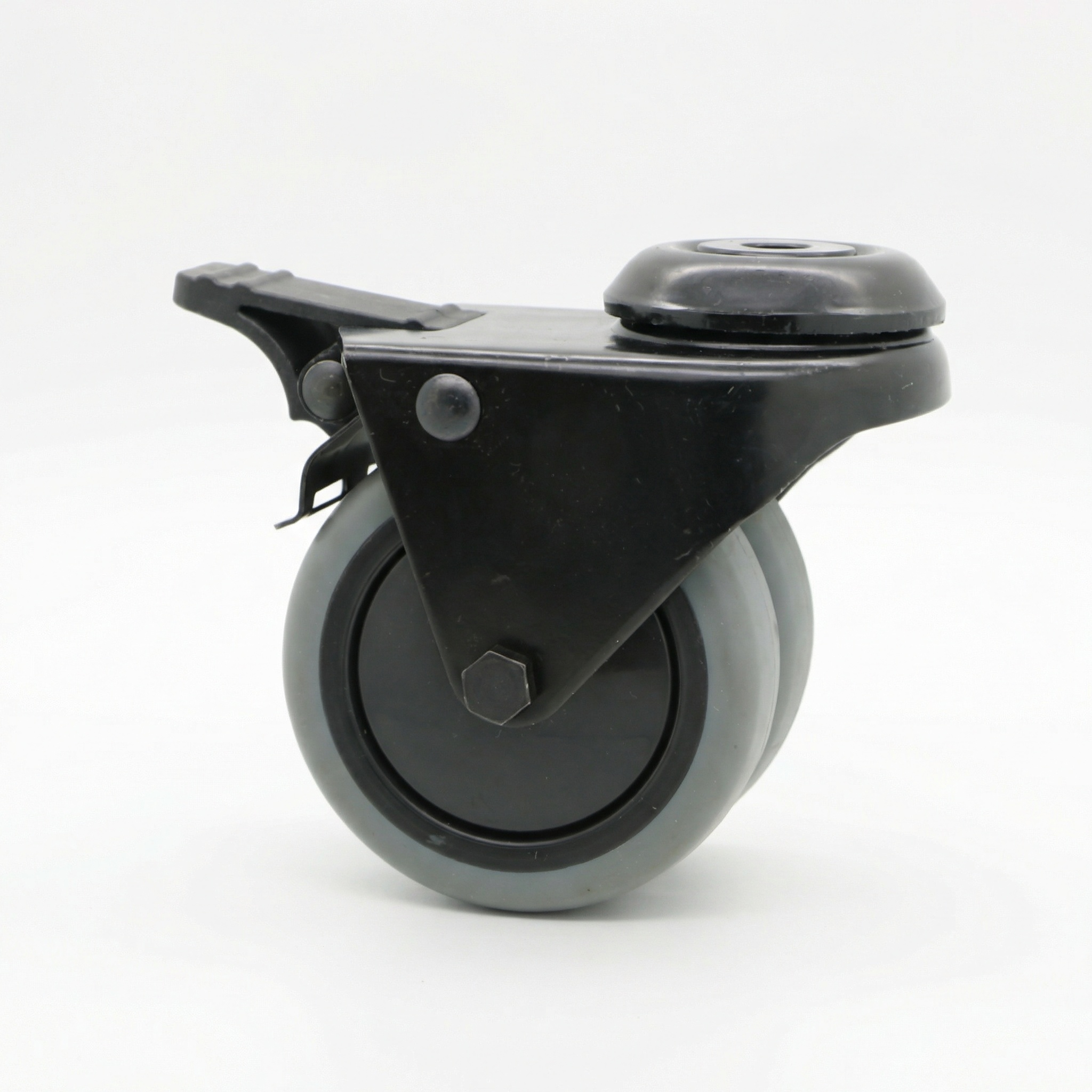 Roulette pivotante noire pour appareil avec frein en acier embouti, trou de boulon, Roue en polypropylène, roulement à billes, Roue-Ø 75mm, 100KG