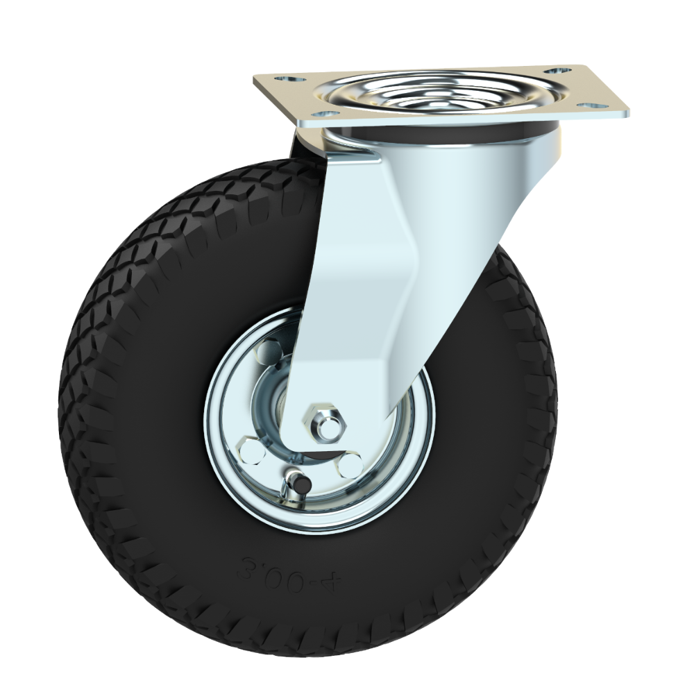 Användningsområden: Utmärkt stötdämpning. Lågt rullmotstånd på ojämna golv. Mycket golvvänlig tack vare pneumatiska däck.